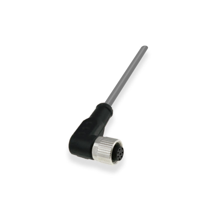 M12 8Pin、母头90°、单端预铸PVC非柔性电缆、灰色