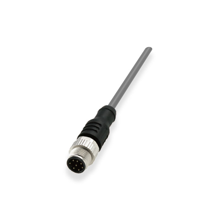 M12 8Pin、公头直型、单端预铸PVC非柔性电缆、灰色护